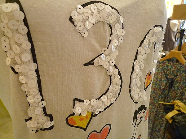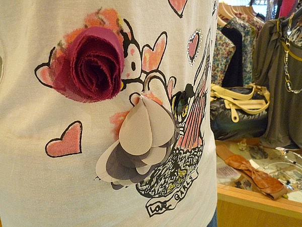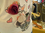 花とハート柄のTシャツは白とモカ、