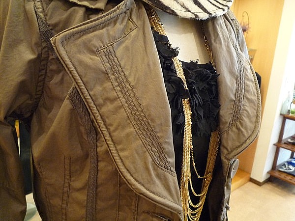 この秋冬は、メンズライクなデザインが目白押しです今回のジャケットも、その流れを汲むものです。 縫製時のテンションを調節して、 しわ感を出し、こなれた雰囲気を醸し出しています。 襟にもワイヤーが入っていて、自在に形作る事ができます。 今回はシンプルなインとボトムを合わせましたが、 パンチの効いた帽子とネックレスで、トレンドを 盛り込んでみました