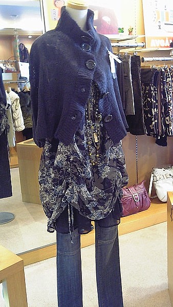 カットソーのボリュームを、薄手でコンパクトなポンチョが、しっかりとラインを引き締めてくれています
